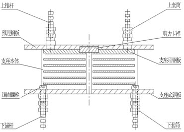 Ⅱ型——支座與墩、梁之間采用套筒連接,支座底面不設預埋鋼板,底鋼板和套筒之間采用錨固螺栓連 接,上預埋板與頂鋼板之間采用卡榫連接,上預埋鋼板與套筒之間采用配合焊接。 HDR(Ⅱ)高阻尼隔震橡膠支座結構示意圖(固定型)